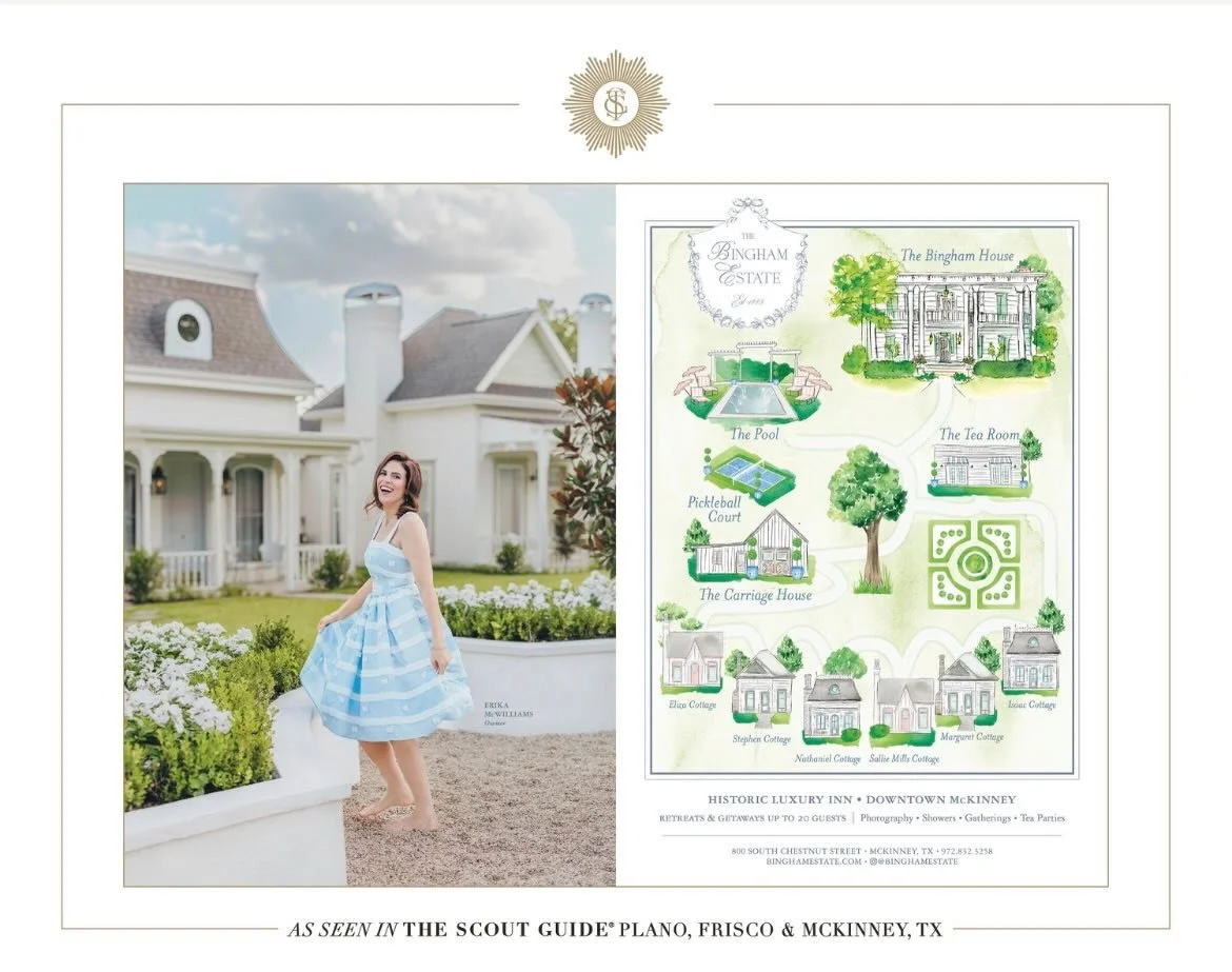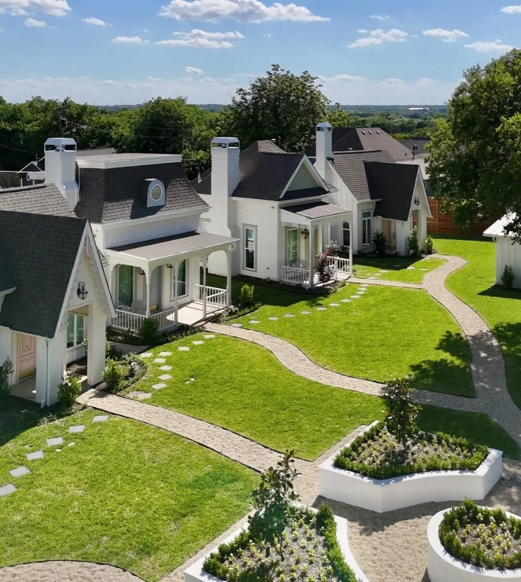 The Bingham offers modern luxury with 6 one-bedroom cottages that boast 11-foot ceilings, cozy gas fireplace, exquisite antique hardwoods, sumptuous king-size bed, luxurious soaking tub with separate shower & convenient wet bar. Whether you choose to stay in one of our "new" historic cottages individually or book them as a group, you'll relish the opportunity to immerse yourself in the charm of the past with a contemporary twist. Named after the Bingham children, each historically-inspired cottages is meticulously designed by McKinney residential designer Mark McReynolds & interior designers Sidewalk Dreamery, showcasing the exceptional craftsmanship of Clover Lane Properties.