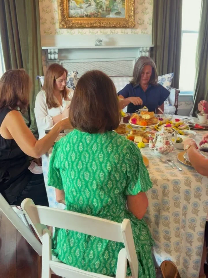 The Isaac cottage is bold and luxurious, with strong pinks, greens, and oranges highlighting ornate touches on the furniture.