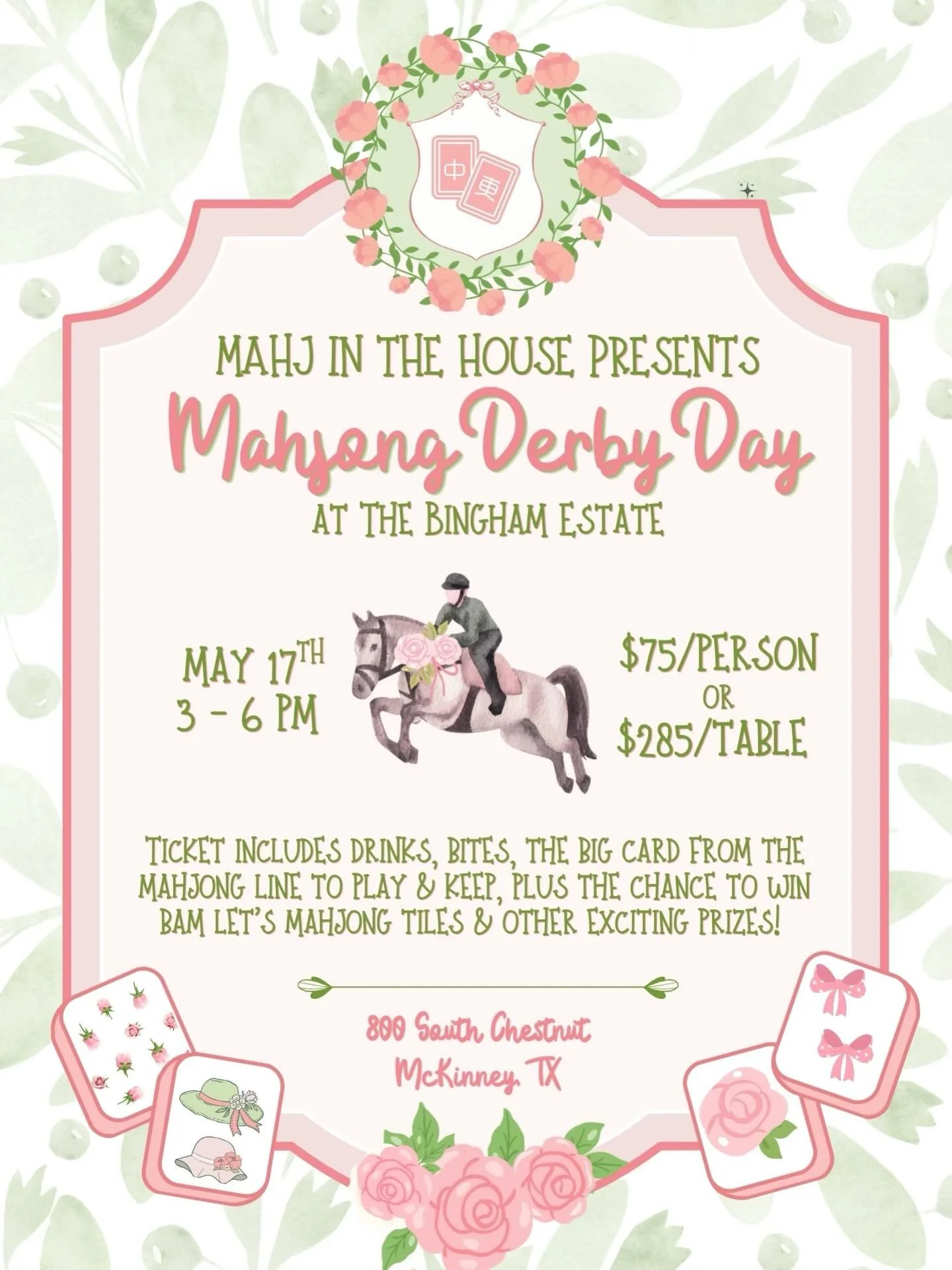 Mahj in the House presents Mahjong Derby Day at The Bingham Estate on Sunday, May 17th from 3 pm to 6 pm. Tickets include drinks, bites, the big card from the mahjong line to play & keep, plus the chance to win Bam Let’s Mahjong tiles & other exciting prizes.